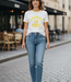 Oversized T-shirt met ronde hals, met biesjes op de mouwen en hals in dezelde kleur als de print. Lees meer..